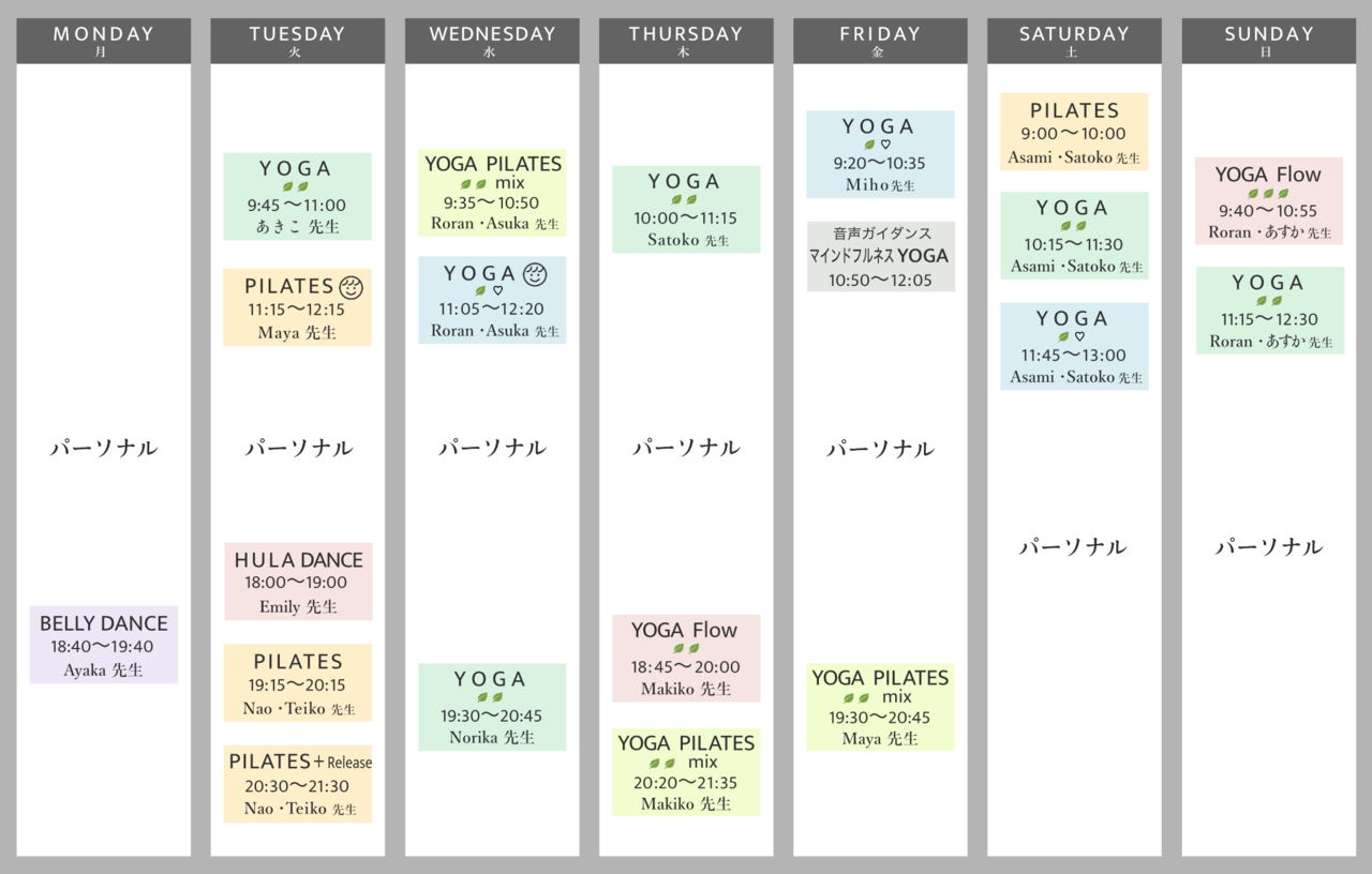1/20(火)から夜のクラスは18:00フラ、19:15ピラティス、20:30ピラティスに変更になります。